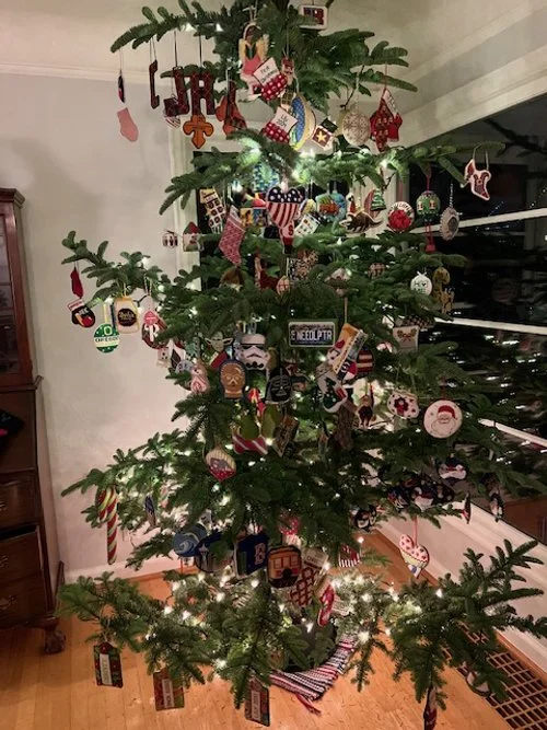 Two hundred needlepoint ornaments stitched and finished by Christy.