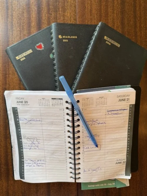My Day-At-A-Glance paper calendar (I have every one from when I started college...LOL!), my cell phone, a needlepoint project, one of my charm bracelets.